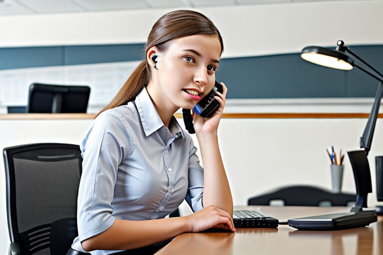 a proxy young lady talking over deskphone in a clean and professional looking room